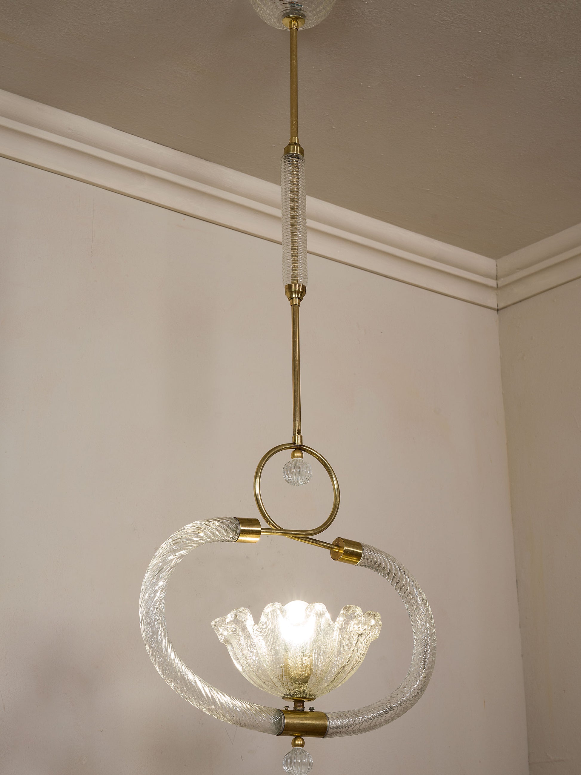 La struttura centrale presenta un anello in ottone dal quale si sviluppa un arco in vetro torchon trasparente che incornicia, al centro, una coppa in vetro a forma di fazzoletto con motivo a rete.